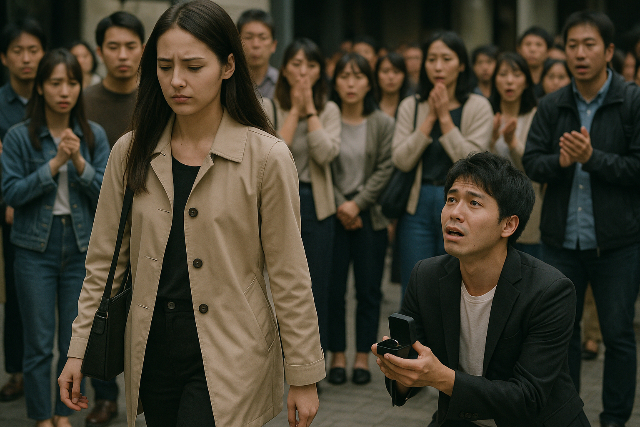 公共の場でプロポーズされ、女性がその場を離れる動画が拡散されると、冷たい反応として受け取られがちです。
